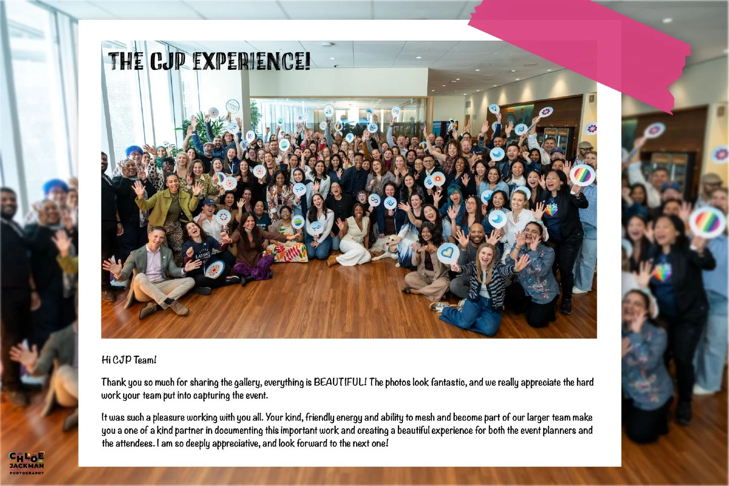 Weβve known Chloe Jackman as an active, engaged, and caring SF community member for many years now, and finally had the chance to work with her company professionally. We hired Chloe Jackman Photography to shoot our nonprofitβs event. Our photographer was communicative, punctual, professional, flexible, and really fun to work with. She felt like a friend at the party who happened to be taking awesome pictures the whole time. Highly recommend!